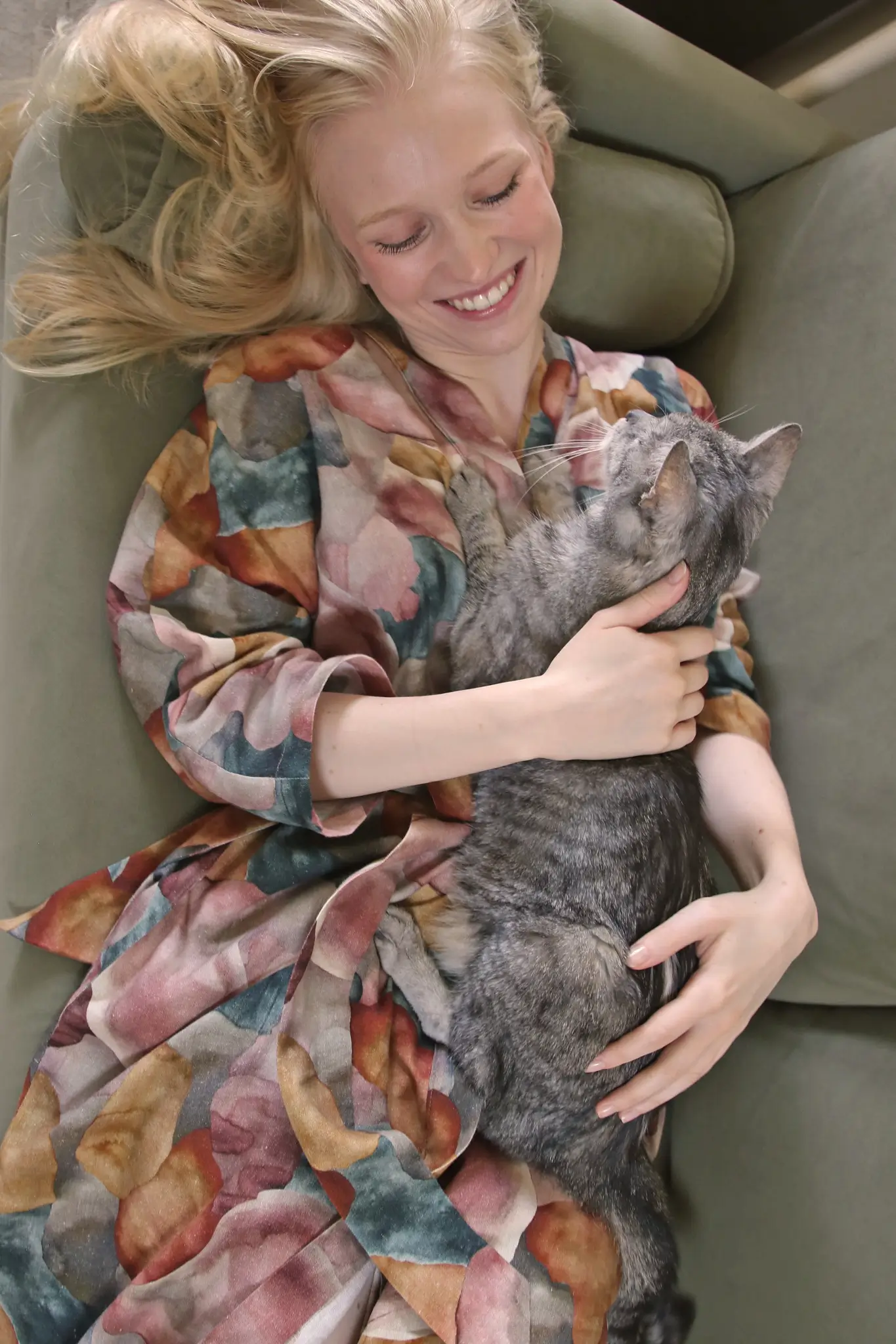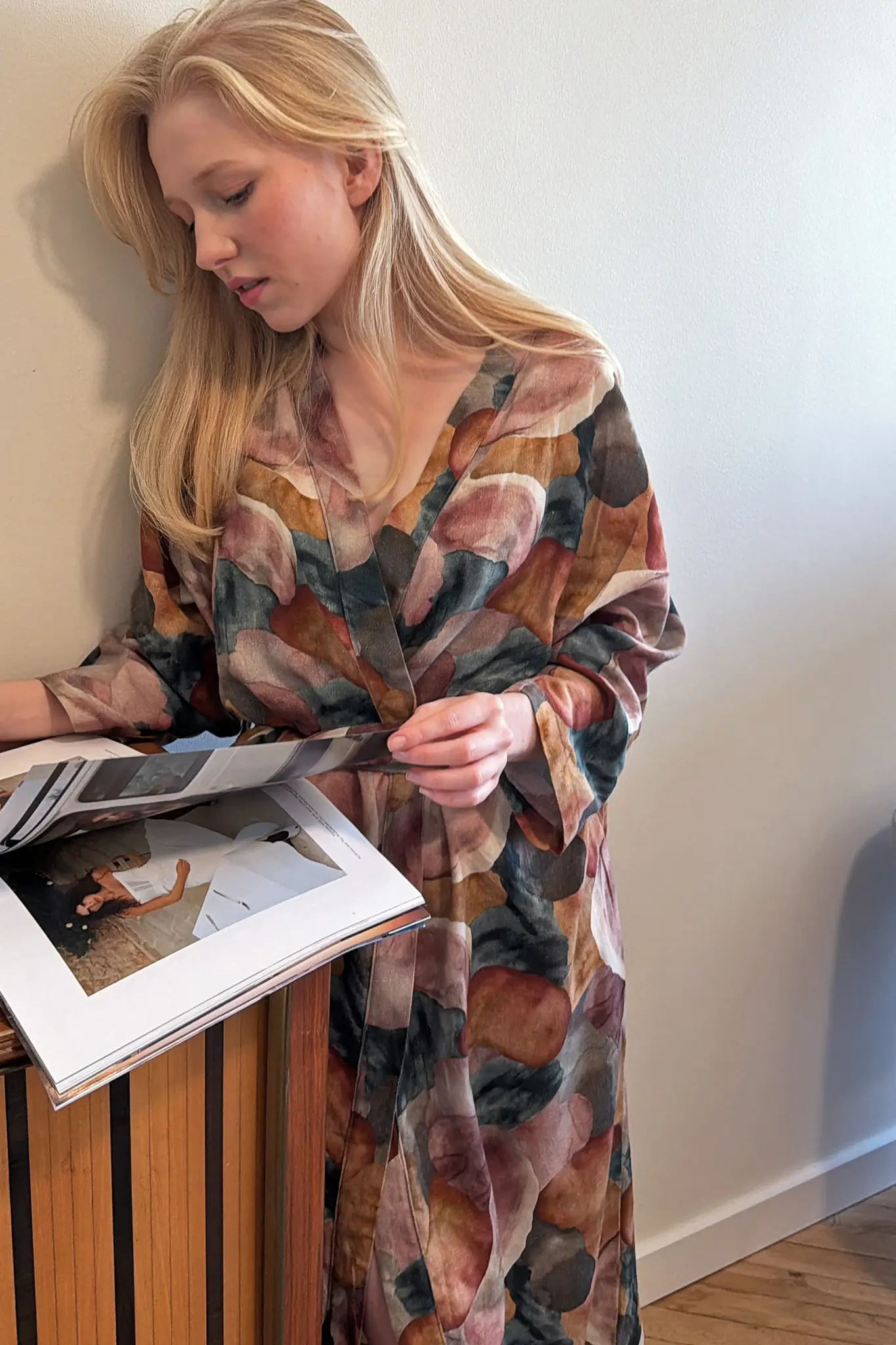 Długie kimono uszyte z tkaniny lnianej z domieszką wiskozy. Wzór na tkaninie to malarskie, akwarelowe plamy w ciepłych odcieniach, które rozlewają się swobodnie po przewiewnym materiale. To kimono otuli Cię czystym pięknem prosto z natury. Domieszka wiskozy sprawia, że materiał jest delikatny i miękko układa się na ciele.