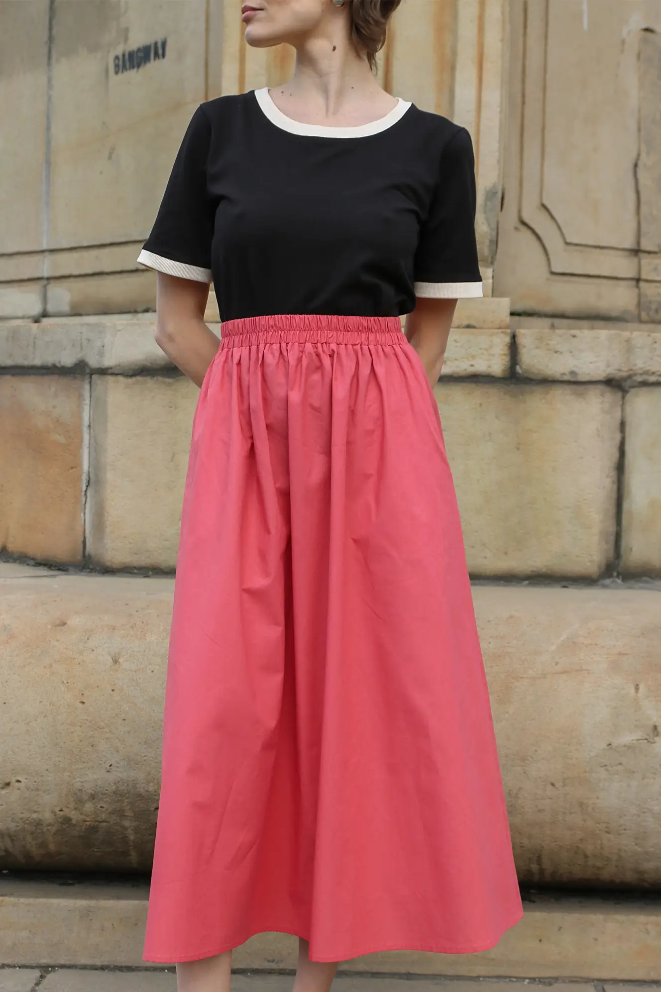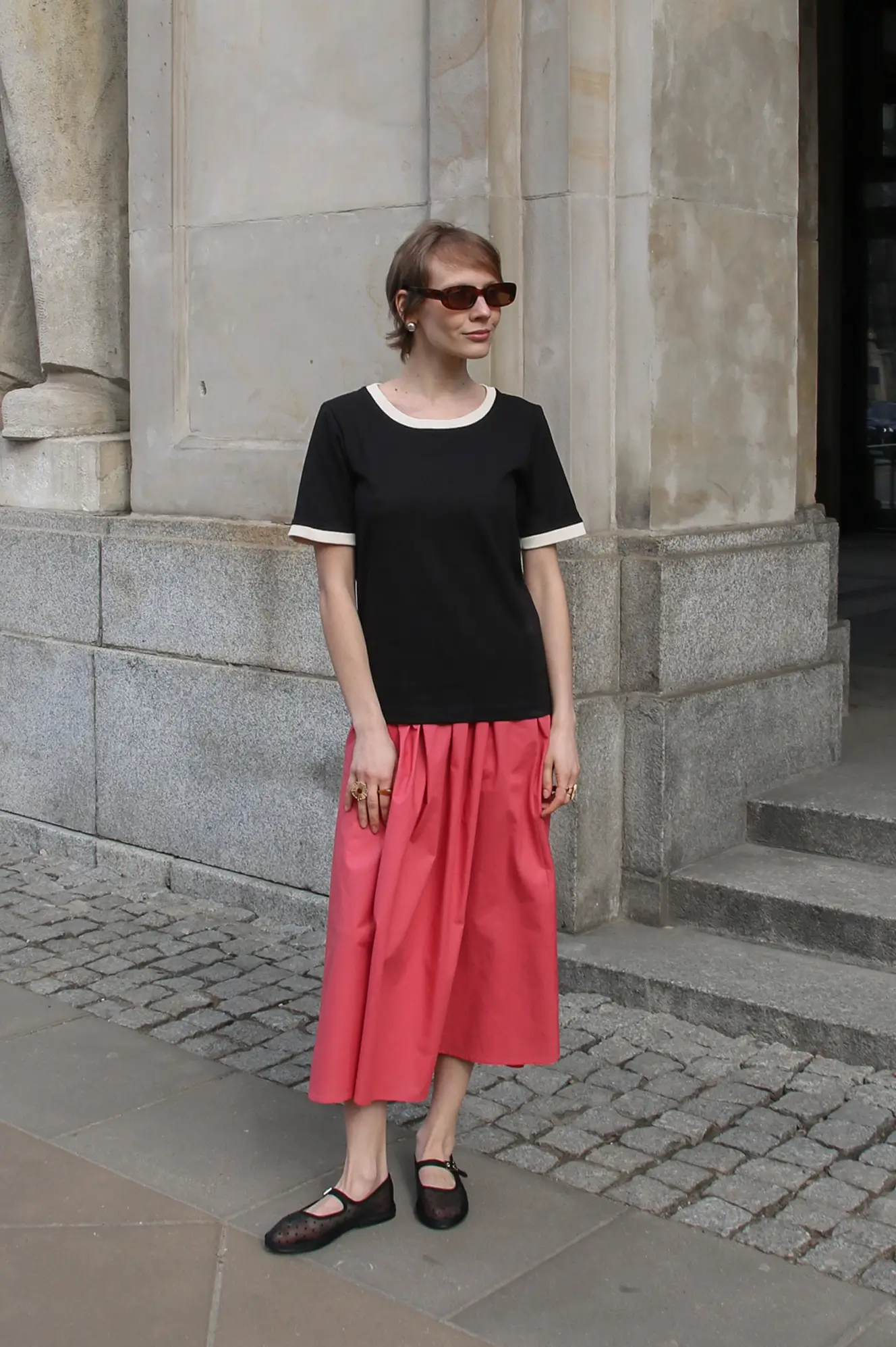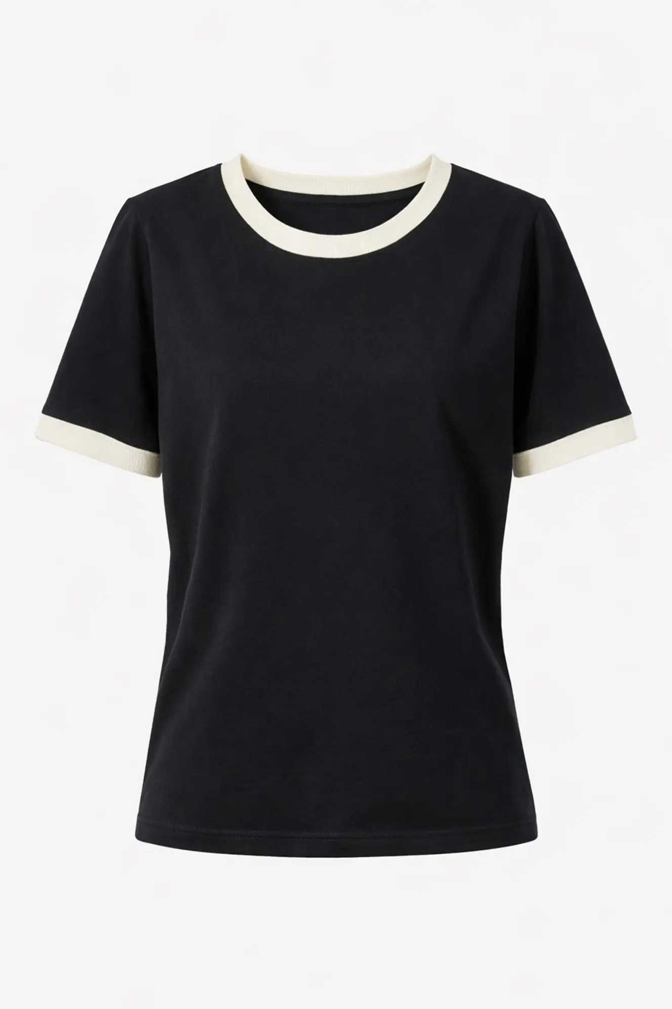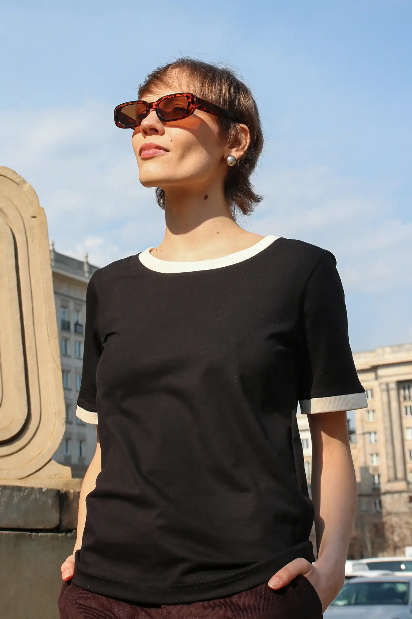 Klasyczny, czarny T shirt z małym twistem. Wykonany z miękkiej, oddychającej bawełny, która zapewnia pełen komfort przez cały dzień. Jego charakterystycznym akcentem jest kontrastowy, kremowy ściągacz przy szyi i na rękawach, który dodaje całości świeżości i sprawia, że prosty fason nabiera wyjątkowego charakteru.
