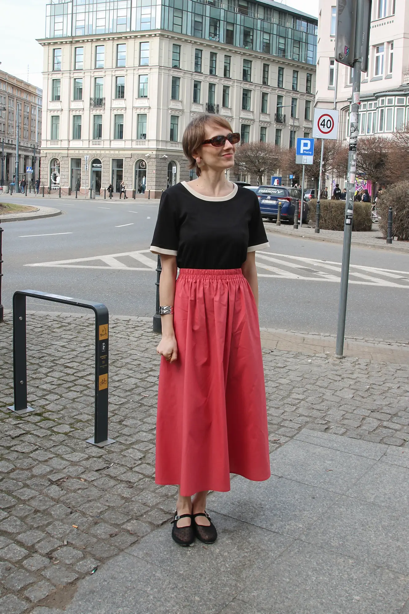 Kontrastowy detal przy dekolcie subtelnie przyciąga spojrzenia i wyróżnia ten model spośród klasycznych basiców. To idealna baza do wielu stylizacji – pasuje do jeansów, spódnic czy pod marynarkę.
