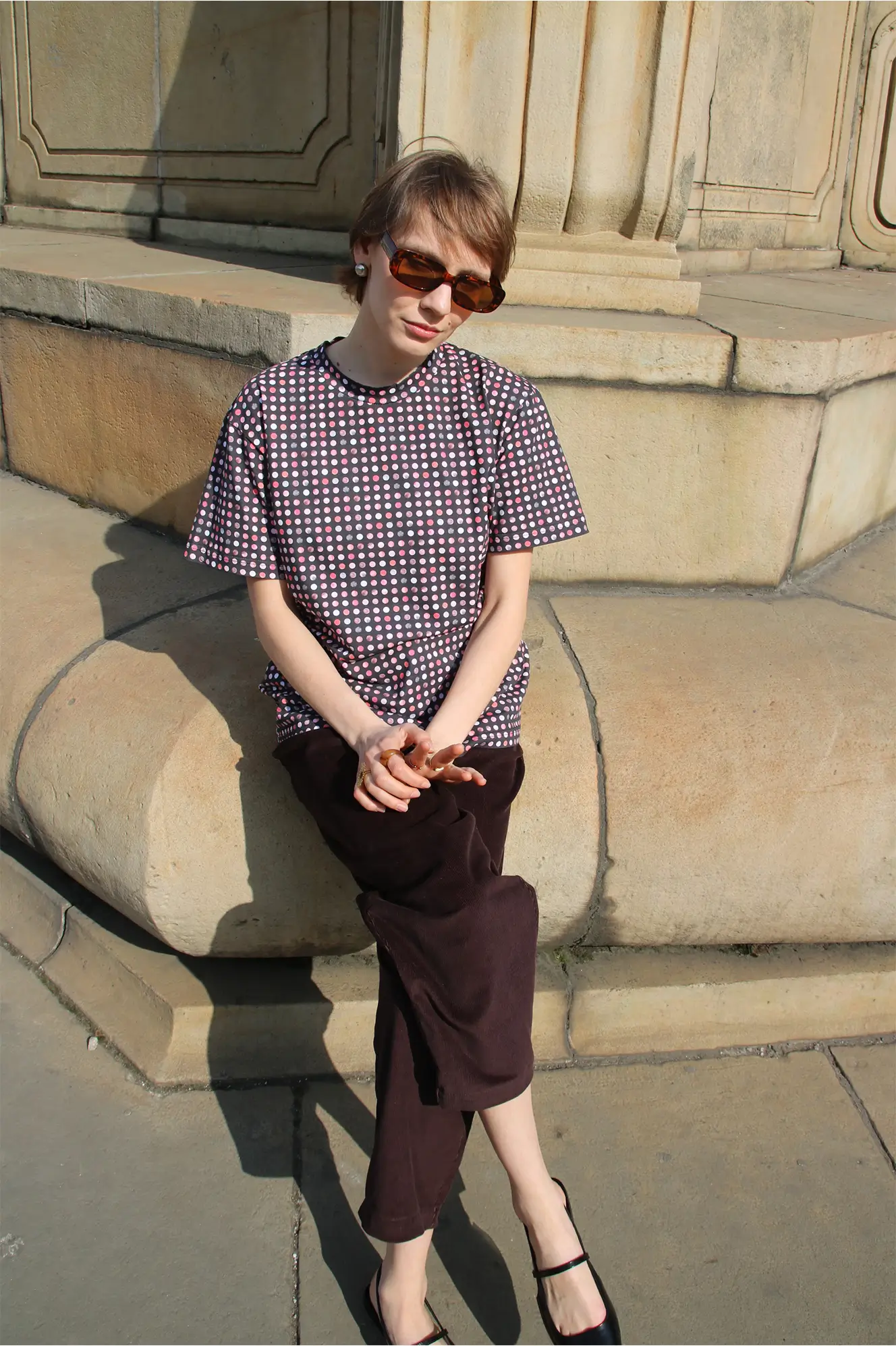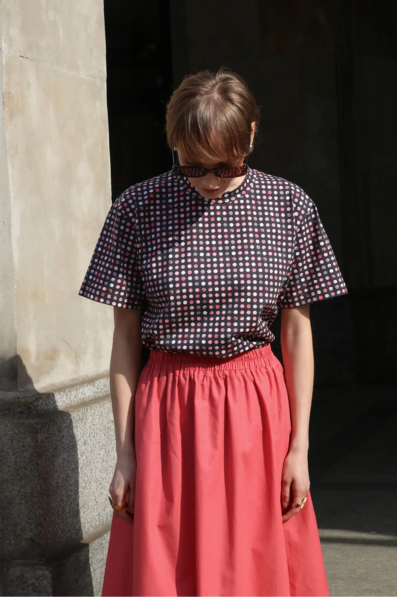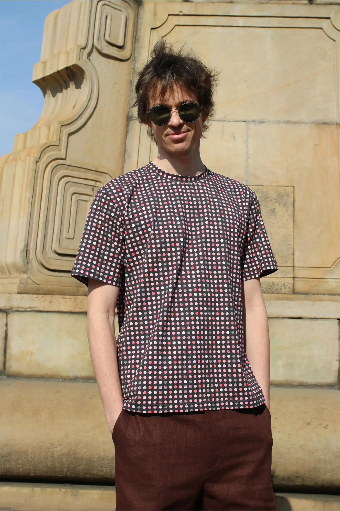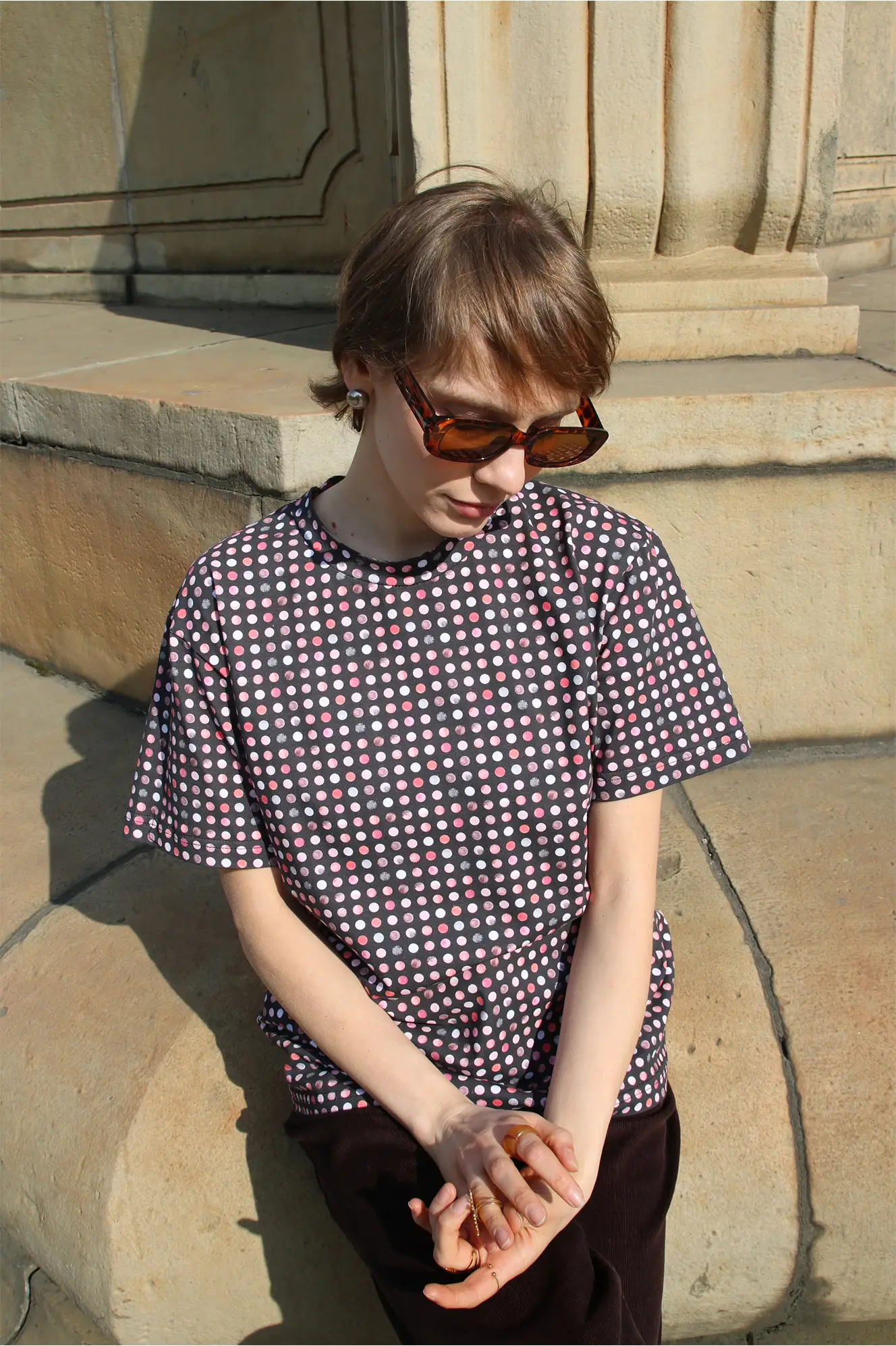 Kolorowy, autorski print w kropki subtelnie wyróżni Cię z tłumu i doda stylizacji energii. Świetnie sprawdzi się w casualowych zestawach z jeansami, a w połączeniu ze spódnicą lub marynarką stworzy ciekawy, przyciągający spojrzenia look.