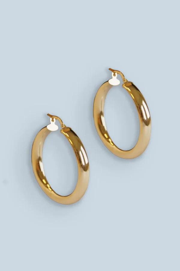 Złote kolczyki koła o delikatnie nieregularnym kształcie.